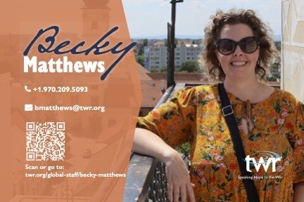 Hello, I am Becky Matthews. I am a Coloradan currently living in Pennsylvania with my husband, Rich. I joined TWR in August 2013 as one of their first telecommuters and serve the Europe